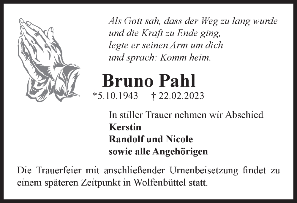 Hier finden Sie alle Traueranzeigen aus der Zeitung, die bisher für Bruno Pahl erschienen sind. Weitere Traueranzeigen, die in der Zeitung erscheinen, werden hier ebenfalls aufgelistet