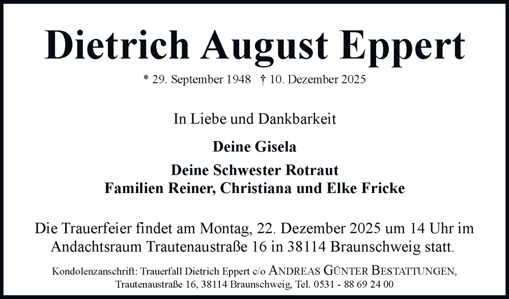 Hier finden Sie alle Traueranzeigen aus der Zeitung, die bisher für Dietrich August Eppert erschienen sind. Weitere Traueranzeigen, die in der Zeitung erscheinen, werden hier ebenfalls aufgelistet