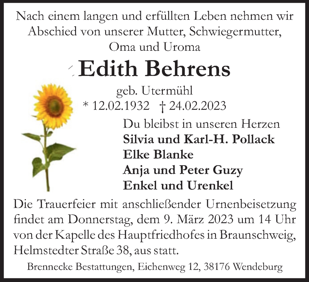 Hier finden Sie alle Traueranzeigen aus der Zeitung, die bisher für Edith Behrens erschienen sind. Weitere Traueranzeigen, die in der Zeitung erscheinen, werden hier ebenfalls aufgelistet