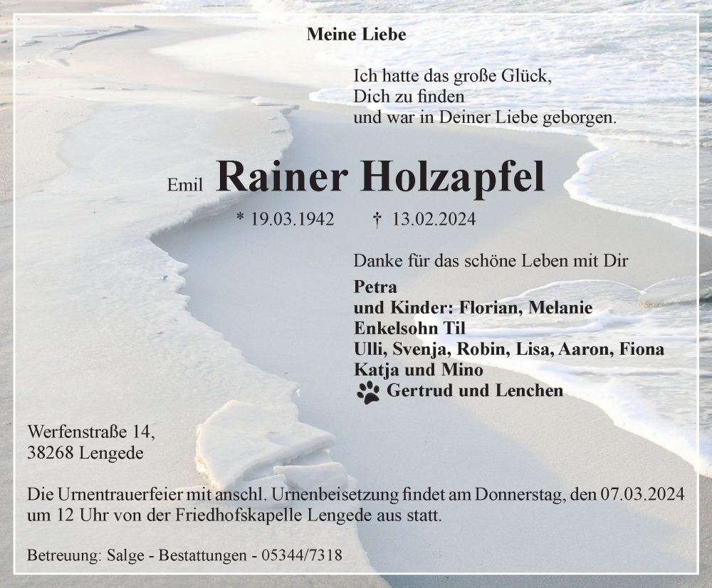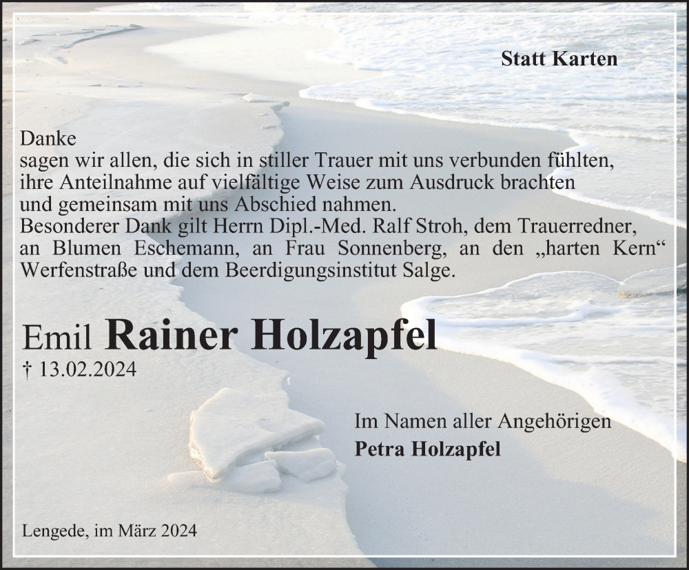 Hier finden Sie alle Traueranzeigen aus der Zeitung, die bisher für Emil Rainer Holzapfel erschienen sind. Weitere Traueranzeigen, die in der Zeitung erscheinen, werden hier ebenfalls aufgelistet