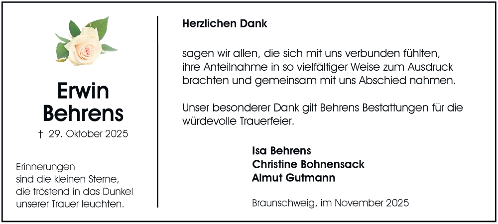 Hier finden Sie alle Traueranzeigen aus der Zeitung, die bisher für Erwin Behrens erschienen sind. Weitere Traueranzeigen, die in der Zeitung erscheinen, werden hier ebenfalls aufgelistet