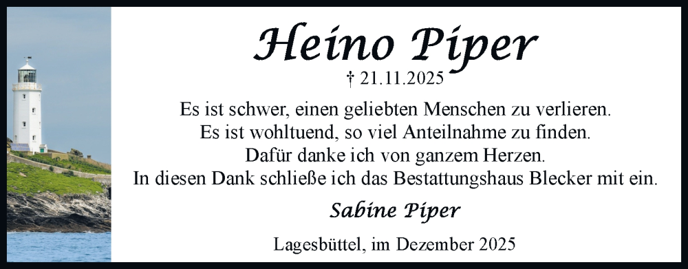 Hier finden Sie alle Traueranzeigen aus der Zeitung, die bisher für Heino Piper erschienen sind. Weitere Traueranzeigen, die in der Zeitung erscheinen, werden hier ebenfalls aufgelistet