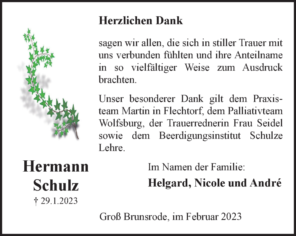 Hier finden Sie alle Traueranzeigen aus der Zeitung, die bisher für Hermann Schulz erschienen sind. Weitere Traueranzeigen, die in der Zeitung erscheinen, werden hier ebenfalls aufgelistet