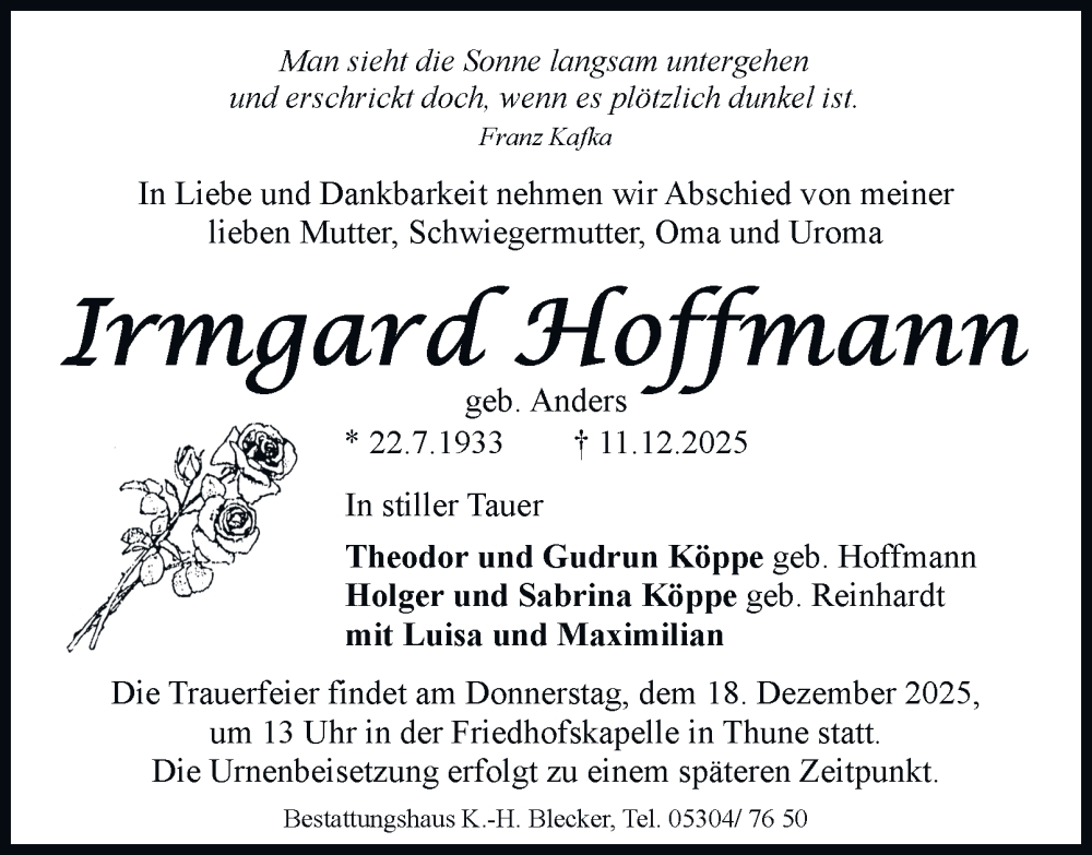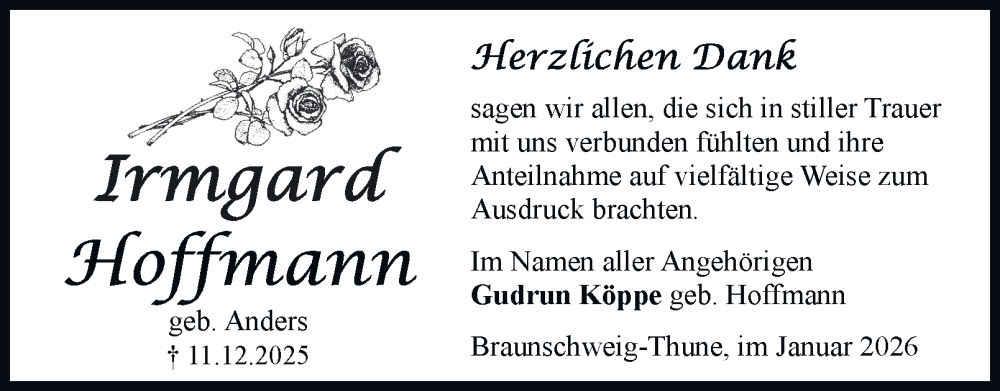 Hier finden Sie alle Traueranzeigen aus der Zeitung, die bisher für Irmgard Hoffmann erschienen sind. Weitere Traueranzeigen, die in der Zeitung erscheinen, werden hier ebenfalls aufgelistet