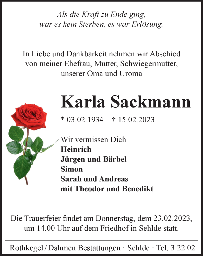 Hier finden Sie alle Traueranzeigen aus der Zeitung, die bisher für Karla Sackmann erschienen sind. Weitere Traueranzeigen, die in der Zeitung erscheinen, werden hier ebenfalls aufgelistet