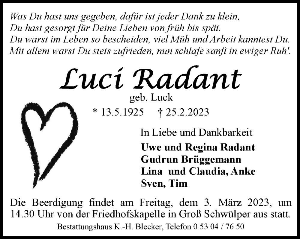 Hier finden Sie alle Traueranzeigen aus der Zeitung, die bisher für Luci Radant erschienen sind. Weitere Traueranzeigen, die in der Zeitung erscheinen, werden hier ebenfalls aufgelistet