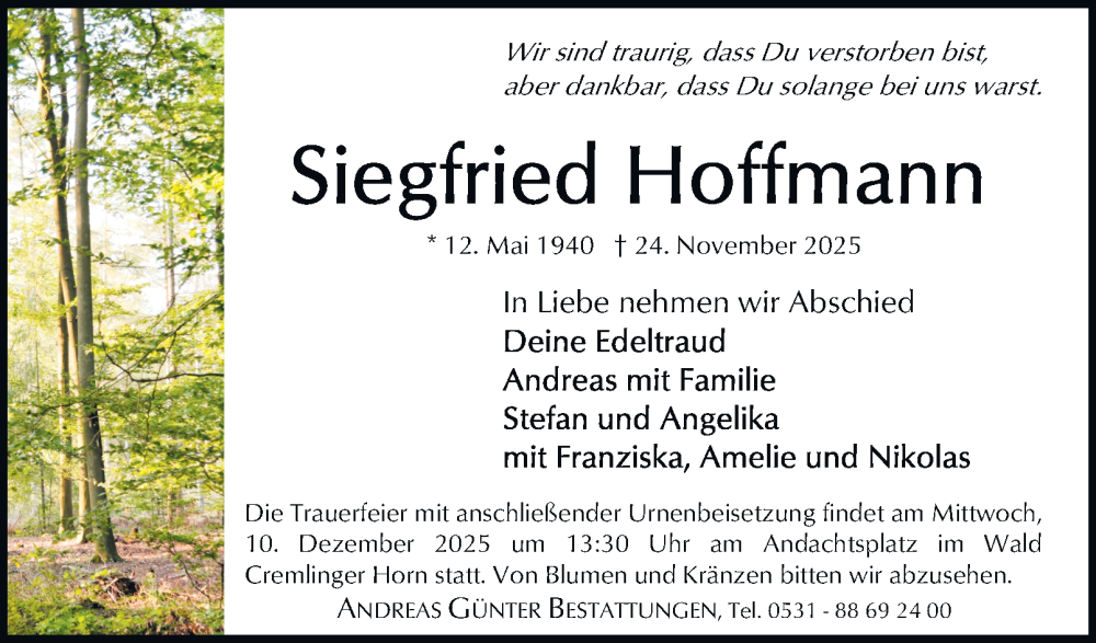 Hier finden Sie alle Traueranzeigen aus der Zeitung, die bisher für Siegfried Hoffmann erschienen sind. Weitere Traueranzeigen, die in der Zeitung erscheinen, werden hier ebenfalls aufgelistet